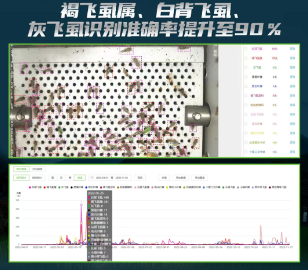 為了驗(yàn)證小蟲(chóng)體智能測(cè)報(bào)系統(tǒng)的準(zhǔn)確性和有效性,2023年托普云農(nóng)深入實(shí)際應(yīng)用場(chǎng)景,主動(dòng)尋找植保測(cè)報(bào)人員,在江蘇、四川、重慶、湖南、廣西、海南7地進(jìn)行了田間試驗(yàn)。結(jié)果顯示,小蟲(chóng)體智能測(cè)報(bào)系統(tǒng)可以及時(shí)監(jiān)測(cè)到田間稻飛虱的暴發(fā),自動(dòng)識(shí)別的稻飛虱數(shù)量準(zhǔn)確度高、可信度高,在稻飛虱的測(cè)報(bào)及防治工作提供了有利的數(shù)據(jù)支撐。此外,在全國(guó)農(nóng)業(yè)技術(shù)推廣服務(wù)中心的牽頭下,托普云農(nóng)在江蘇、四川、云南等地分別進(jìn)行試驗(yàn),經(jīng)過(guò)驗(yàn)證,小蟲(chóng)體智能測(cè)報(bào)系統(tǒng)對(duì)褐飛虱屬、白背飛虱、灰飛虱的識(shí)別準(zhǔn)確率可達(dá)90%以上,與人工鑒定的結(jié)果基本一致,飛虱發(fā)生峰值和趨勢(shì)擬合度基本一致。2024年托普云農(nóng)繼續(xù)參與全國(guó)農(nóng)技服務(wù)中心在福建、江西、湖南、廣東、廣西、貴州組織開(kāi)展的田間試驗(yàn),以進(jìn)一步豐富趨光性毫米級(jí)蟲(chóng)類(lèi)的數(shù)據(jù)庫(kù),提升飛虱葉蟬類(lèi)小蟲(chóng)體的智能燈誘監(jiān)測(cè)技術(shù)。